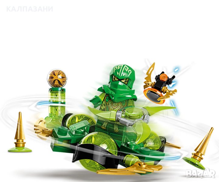 Екшън играчката „Драконовото спинджицу завъртане на Лойд (71779)“ позволява на феновете на нинджи на възраст над 6 години да тренират своя герой и да му помагат да подобри уменията си по спинджицу, подхранвани от драконската сила. Комплектът с въртяща се играчка осигурява на децата безкрайни опции за игра, докато сами или с приятели прекарват безкрайни часове, докато Лойд се придвижва по писта с препятствия в Голямата гора. Помогнете на нинджа да развие умения по спинджицу Децата могат да поставят Лойд с драконска сила в спинъра, украсен с 3 ексклузивни зелени елемента за драконска сила, да го завъртят и да гледат как се върти бързо. Неговата задача е да избегне препятствията с шипове, да победи Имперския дроид и да грабне колекционерския енергиен двигател на златния дракон от купа. Има също така и зелен елемент за драконска сила, а децата могат да съберат още 4 в различни цветове в други комплекти NINJAGO®. Забавна дигитална среда за феновете на LEGO® Приложението LEGO® Builder направлява вас и детето ви в лесно и интуитивно строително приключение. Мащабирайте и завъртайте 3D моделите, записвайте комплекти и проследявайте напредъка си.