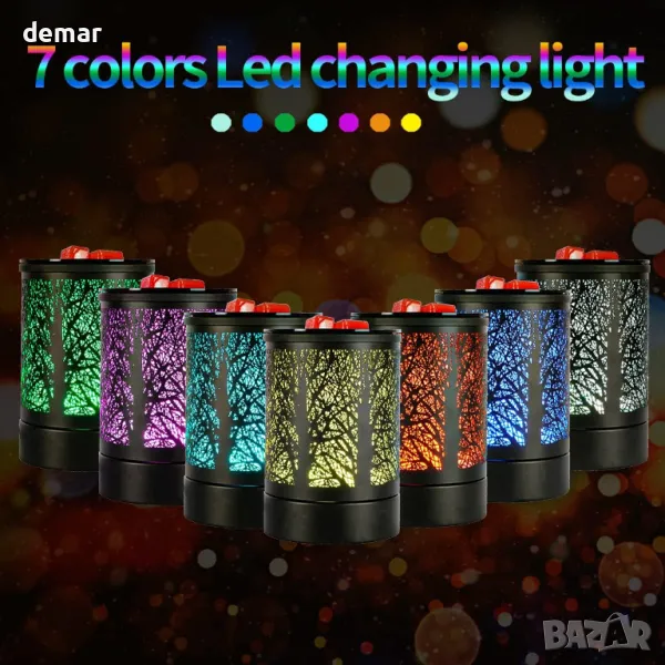 Електрическият нагревател за топене на восък се удвоява като 7-цветна нощна лампа, предлагаща спокойно и атмосферно осветление, идеално за работа, почивка или сън. Поставете восък или смес от етерични масла с вода, за да се нагреят и разтопят, освобождавайки избрания от вас аромат у дома. Неговият елегантен дизайн се отличава с метален мотив на дърво със сменяема силиконова тава за лесно почистване. Нагревателят променя цветовете постепенно и може да бъде настроен на определен цвят, работейки без пламък, сажди или замърсители. Загрява бързо (5-10 минути) благодарение на вградените PTC нагревателни елементи, осигурявайки стабилна температура и дълготраен аромат, което го прави рентабилен и подобрява качеството на въздуха. Тази универсална горелка за восък служи както като лампа за настроение, така и като дифузьор на аромати. Освен това, това е отличен избор за подарък за различни поводи като рождени дни, Коледа, годишнини и други, идеален за семейството и приятелите.