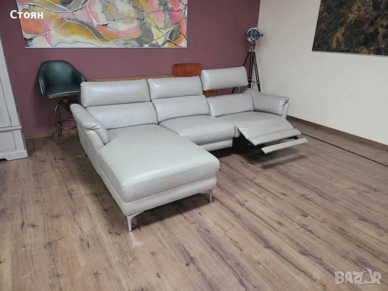 Сив кожен ъглов диван с електрически релаксиращ механизъм → Обява 43429018