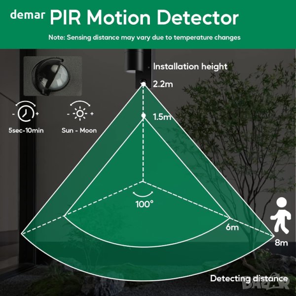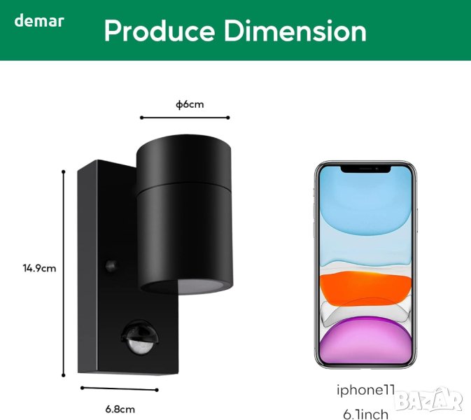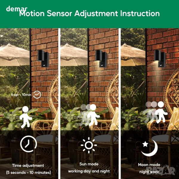 Осветителното стенно осветително тяло, с елегантен модерен дизайн, е идеално за подобряване на естетиката на вашия дом. През нощта той превръща външните пространства в красиво осветени зони, идеални за прекарване на време с приятели и деца. Този външен аплик за вила също е рентабилен, като ви помага да спестите сметки за електричество и осигурява безопасност на тъмно, особено за деца. Той разполага с регулируем сензорен детектор с настройки за ВРЕМЕ и РЕЖИМ, които могат да се персонализират: ① Регулирането на времето позволява да зададете продължителността, през която светлината остава включена след откриване на движение (5 секунди до 10 минути), и ② Регулирането на режима ви позволява да изберете кога сензорът да работи (цял ден или само през нощта). Безопасността е допълнително подобрена с водоустойчив рейтинг IP44, елиминиращ опасностите за безопасността и го прави подходящ за употреба на открито. Висококачествената конструкция от неръждаема стомана предотвратява корозия и ръжда. Монтажът е лесен, с предоставени подробни инструкции, а цилиндричното тяло на лампата пасва на всякакви LED крушки с цокъл GU10 до 35 W (крушките не са включени).