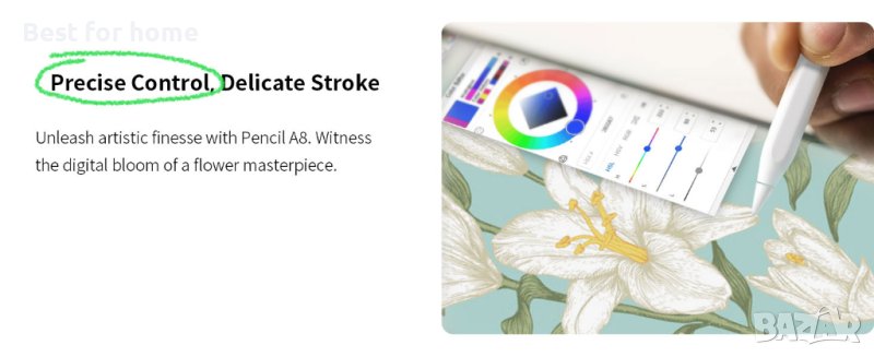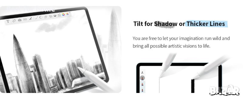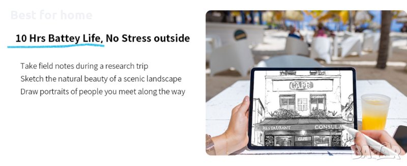 0,1 мм точност на пикселите, чувствителност към наклон: Мастилото тече плавно от 0,069-инчов връх в реално време без забавяне. Можете да пишете калиграфски думи и да рисувате тънки линии с лекота. Моливът A8 може да се накланя за сянка в [Pencil Brush] или да се накланят по-дебели линии в [Marker Pen] за рисуване, рисуване и маркиране на документи.