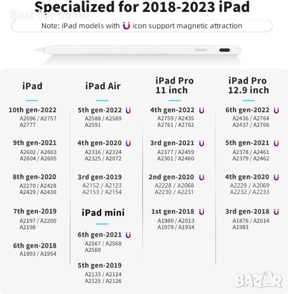 【Специализирано за iPad 2018-2023】Моля, проверете листа за съвместимост, за да потвърдите дали вашето устройство е съвместимо, преди да купите, или се свържете директно с нас. metapen iPad Pen Stylus A8 само за Apple iPad (6-то, 7-мо, 8-мо, 9-то и 10-то поколение); iPad Air (3-то, 4-то и 5-то поколение); iPad mini (5-то и 6-то поколение); 12,9-инчов iPad Pro (3-то, 4-то, 5-то и 6-то поколение); 11-инчов iPad Pro (1-во, 2-ро, 3-то и 4-то поколение). ); Метод: Настройки > Докоснете Общи > Докоснете Информация > Име на модела [iPad XX (поколение