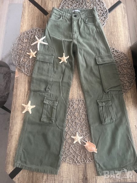 Дънките са във войнишко зелен цвят, без еластичност. Размер С са, но отговарят на М.