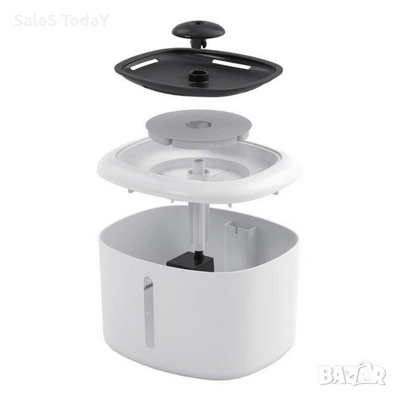Фонтан - поилка за котки и малки кучета, 5V, 0.25W. Разполага с голям резервоар за вода с индикатор за ниво, помпа и филтърна шайба с активен въглен. Със здрави памучни влакна, йонообменна смола и гранули от активен въглен, те поддържат водата чиста от косми и други замърсявания. Работи с USB кабел и помпата се нуждае от почистване веднъж месечно за най-добри резултати.