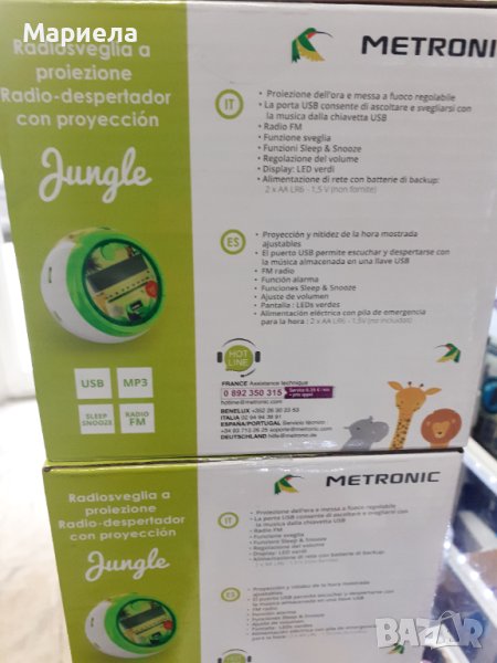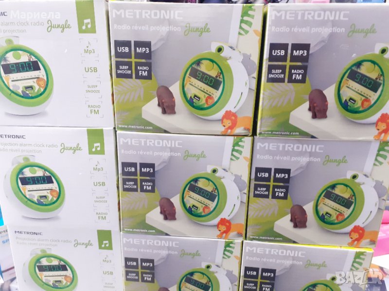 Нови-закупени от Германия ,намалени от 35евроЧисто нови-фабрично запечатани закупени на промоция от:https://www.amazon.de/-/en/Metronic-477030-Projection-Functions-Batteries-Jungle-Green/dp/B08DL4818R?th=1MetronicЦвятЗелена джунглаТип дисплейДигиталенстилТрадиционенСпециално свойствоАларма, радио, прожекционен часовникРазмери на продукта13 Ш x 366 В сантиметраИзточник на захранванеЕлектрически с кабелВъзрастова група (описание)хлапеФормаКръгълМатериалПластмасаВижте по-малкоОтносно този артикулДетската вселена на тема джунгла с нейните твърде сладки животни ще зарадва всяко дете и ще го остави да пътува в приятна и забавна средаС този радио будилник с USB порт вашето дете може да избере дали да се събуди: традиционна аларма, любимо радио или любима музика, съхранена на USB паметВашето дете ще хареса регулируемата и регулируема проекция, която ви позволява да гледате часа на стената или тавана. Синхронизирането на проектираното и показваното време е напълно автоматичноВъзможно е също така да поставите 2 x AA батерии LR6 (1,5 V) (не са включени), които спестяват време в случай на прекъсване на захранването и никога не закъсняват на училище