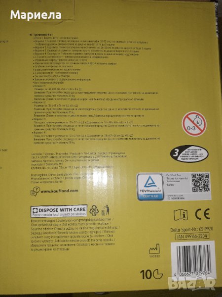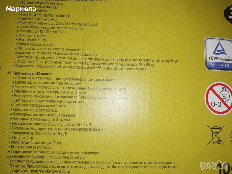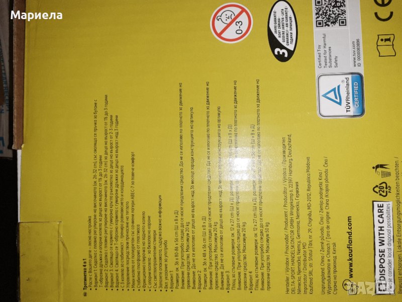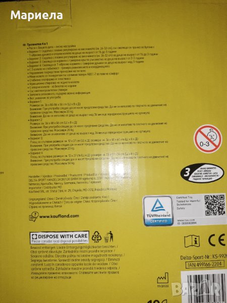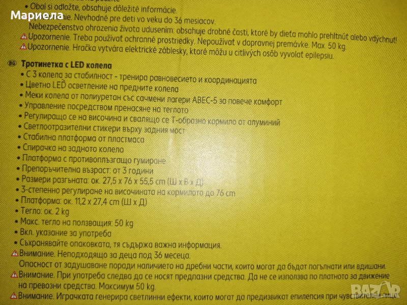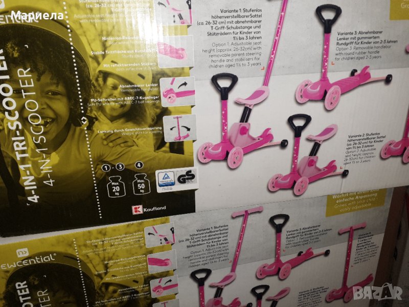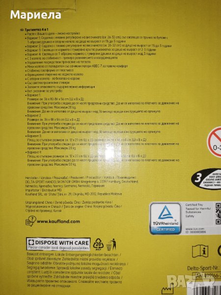 - Тротинетка 4 в 1 е лесна за настройване и расте с Вашето дете- C 3 колела за стабилност - тренира равновесието и координацията- Управление посредством пренасяне на теглото- Меки колела от полиуретан със сачмени лагери АВEC-7 за повече комфорт- Стабилна платформа от пластмаса- Фрикционна спирачка на задното колело- С опорни колела - за безопасно каране- Със светлоотразителни стикери- Вкл. указание за употребаХарактеристики:• Вариант 1: Седалка с плавно регулиране на височината (ок. 26-32 см), със сваляща се пръчка за бутане с Т-образна дръжка и опорни колела за деца на възраст от 1 до 3 години• Вариант 2: Седалка с плавно регулиране на височината (ок. 26-32 см) за деца на възраст от 1,5 до 3 години• Вариант 3: Свалящо се кормило с гумирана кръгла ръкохватка за деца на възраст от 2-3 години• Вариант 4: Свалящо се Т-образно кормило с гумирани дръжки за деца на възраст над 3 годиниРазмери:• Вариант 1: ок. 36 х 80-86 x 56 cm (ШxВxД)• Вариант 2: ок. 36 х 48 x 56 cm (ШxВxД)• Baриант 3: ок. 36 х 48 х 60 cm (ШxВxД), Площ за стъпване ок. 12 х 27 cm (ШxД)• Вариант 4: ок. 28 х 67 х 56 cm (ШxВxД), Площ за стъпване ок. 12 х 27 cm (ШxД)Максимално натоварване:• Вариант 1: 20 кг.• Вариант 2: 20 кг.• Baриант 3: 20 кг.• Вариант 4: 50 кг.Внимание: При употреба следва да се носят предпазни средства.Внимание: Да не се използва по платното за движение на превозни средства.Внимание: Вариант 1 и 2 не са подходящи за използване от деца на възраст над 36 месеца поради конструкцията на артикулаМаксимално натоварване 20 кг. при Варианти 1, 2 и 3Максимално натоварване 50 кг. при Вариант 4