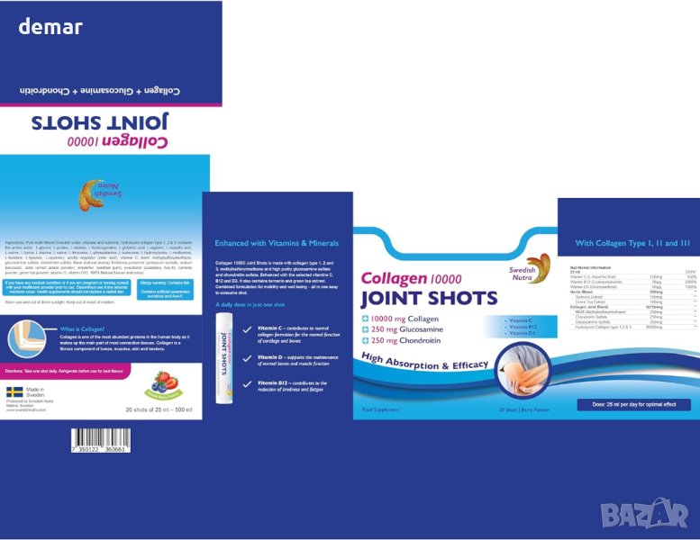 Изпитайте предимствата на Collagen 10000 Joint Shots, първокласна течна колагенова смес, съдържаща хидролизиран колаген тип I, II и III. Този мощен протеин поддържа кожата, костите, сухожилията, връзките, косата и ноктите. Всеки шот от 25 ml съдържа цели 10 000 mg колаген. Но това не е всичко! Тази течна формула с вкус на горски плодове е обогатена с основни хранителни вещества, включително глюкозамин, хондроитин, МСМ, витамин B12, витамини C и D за здравето на костите и хрущялите, както и смес от билки от куркума и зелен чай. Насладете се на бързо усвояване и водоразтворими витамини за бързи ползи. Нашите продукти са без ГМО, без глутен, без лактоза и са идеални за възрастни от всички полове.