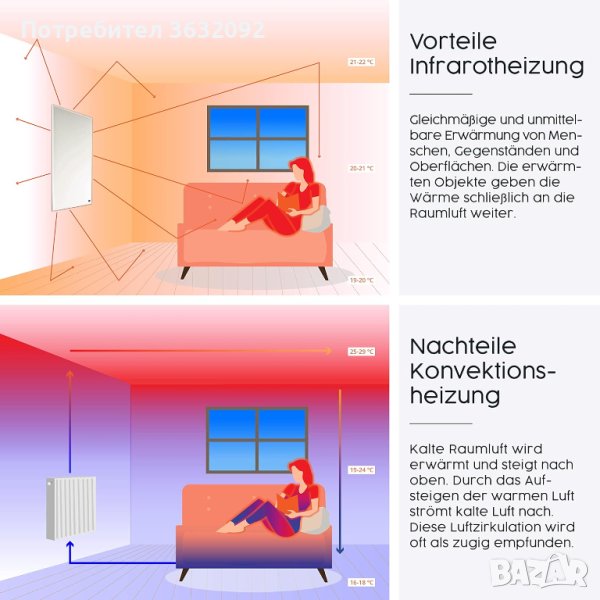 Усещането за топлина е сравнимо с лъчите на слънцето. Усещането за топлина е подобно на това, когато сте осветени директно от топлото слънце в ясен зимен ден. Дори в такова студено време тялото е приятно затоплено. Вече можете да получите това усещане, което се възприема като особено приятно, и за вашите стаи у дома.