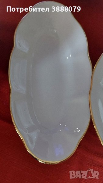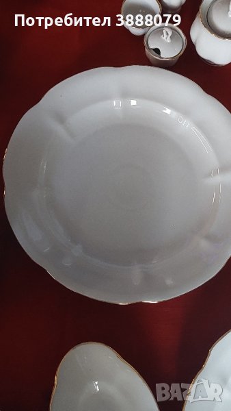 Изчистен руски порцеланов сервиз за хранене със златен кант от 36 части. Донесен е от Киев 1981 година. Никога не е ползван Състои се от:6 бр.чинии за основно 23,5 см.6 бр. дълбоки чинии 23,5 см.6 бр.чинии за предястие 19,5 6 бр. десертни чинии 17,5 1 бр. кръгло плато 30,5 1 бр. кръгло плато 29 см 1 бр. елипсовидно плато 27 см 1 бр. елипсовидно плато 35,5 см 1 бр. сосиера 1 бр. дълбока купа 23 см 1 бр. захарница 1 бр. солница 1 бр. чашка за подправки с капак1 бр. чашка за подправкиСервизът е в оригиналния си кашон. Тъй като е много тежък е препоръчително лично предаване.