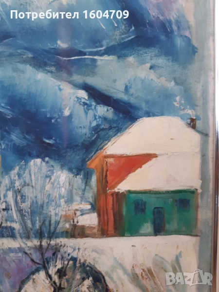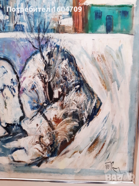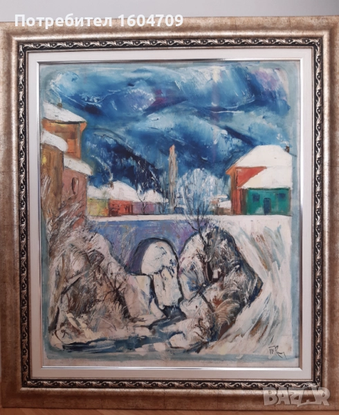 Картина на Тодор Калпакчиев - "Зимен пейзаж" от 70-те години на миналия век. Маслени бои на платно с размер 60/70см и 77/90см със рамка. Картината е укрепена и претърпяла лека реставрация със нова рамка. Подписана.