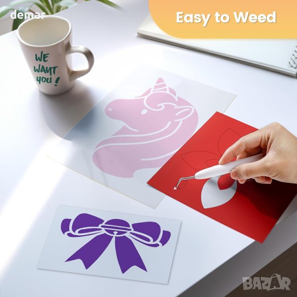Пакетът "Самозалепващи винилови листове" включва 74 листа, всеки с размери 12" x 12", в 38 различни цвята. Този комплект се състои от 60 листа в 31 обикновени цвята и 14 листа в 7 матови цвята, подходящи за различни творчески проекти. Имайте предвид, че хартията за прехвърляне не е включена. Тези винилови листове са лесни за употреба, съвместими с всички машини за рязане и идеални за начинаещи. Тяхната гладка текстура и оптимална дебелина улесняват лесното рязане, плевене и прехвърляне. Изработени от водоустойчив материал, те осигуряват силна адхезия към всяка гладка, равна повърхност и са подходящи както за вътрешни, така и за външни приложения. Те са издръжливи, устойчиви на бръчки, не избледняват и без мехурчета, запазвайки вашите дизайни ефективно. Винилът е универсален, перфектен за декориране на предмети като чаши, стенописи, саксии, дървени изделия, поздравителни картички, буркани за съхранение, балони, капаци за телефони, стикери за автомобили и парти декорации. Важно е обаче да се отбележи, че този винил не е подходящ за HTV (Heat Transfer Vinyl), не може да се печата и не се препоръчва за използване върху плат.
