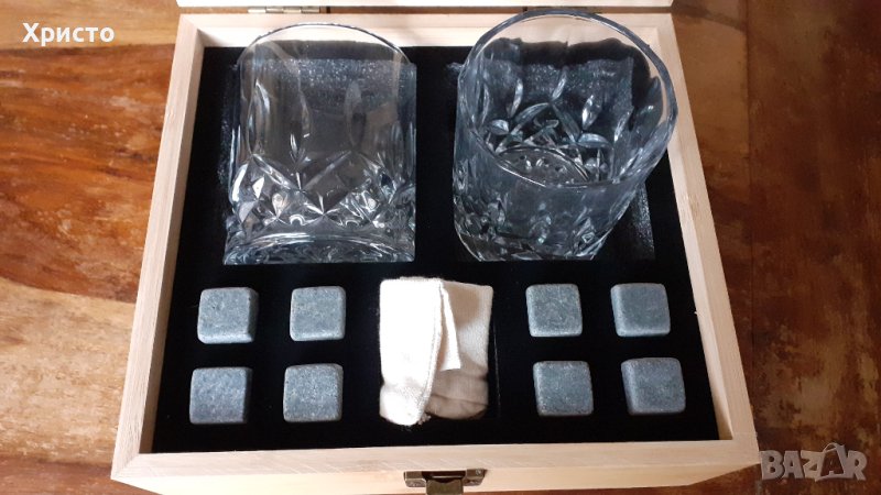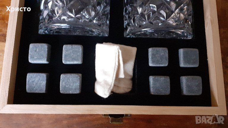 Продавам чаши масивни стъклени с каменни кубчета лед в масивна дървена кутия. Кутията е от естествен бамбук. Чашите са за уиски, ром, джин, водка, мохито или други напитки. Включва 2 чаши (300 ml), високи 9,2 см, външен диаметър ф 8 см, в горната си част не са цилиндър, а елегантен многоъгълник - снимка 9. 8 каменни кубчета лед за многократна употреба с размер 2х2х2 см и памучна торбичка за съхранение, както и щипка в капака от вътрешната страна. Кутията е от естествено дърво бамбук, красива масивна дървесина с метални ретро панти и закопчалка. Размерите на кутията са 21,5х19,5х10,5 см, и теглото на целия продукт е 1,8 кг. Супер подарък.