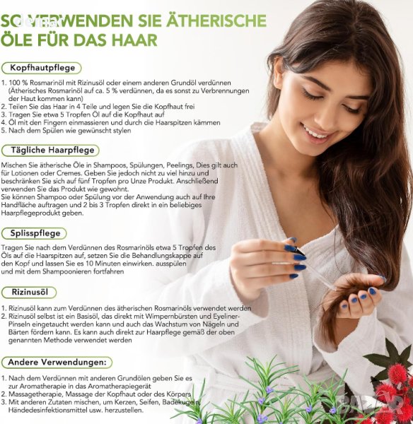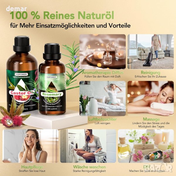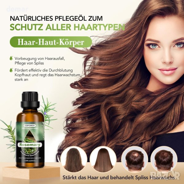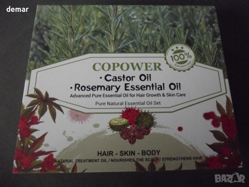 Комплектът 100% чист розмарин и рициново масло, сертифициран от Ecocert, предлага естествено и веганско решение за грижа за косата и кожата. Маслото от розмарин подобрява кръвообращението на скалпа, като насърчава растежа на косата и предотвратява загубата, докато рициновото масло, получено чрез студено пресоване без хексан, е богато на витамин Е и омега-6 мастни киселини, идеални за хидратиране на кожата, грижа за скалпа и укрепване на ноктите. И двете масла са универсални, подходящи за използване в дифузори, кремове за лице, масажи и други проекти „Направи си сам“. Комплектът включва 50 ml масло от розмарин и 100 ml рициново масло в устойчиви на U/V кехлибарени бутилки, заедно с аксесоари като капкомери и четки за лесно нанасяне. Този дерматологично контролиран комплект без жестокост е идеален за всички типове коса и е идеален подарък