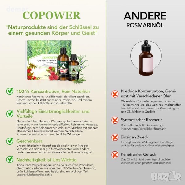 COPOWER Комплект масла за растеж на косата, 50 мл розмарин и 100 мл рициново масло
