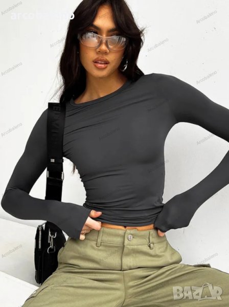 Нова дамска тениска с дълъг ръкав и кръгло деколте в плътен цвят, 6цвята
