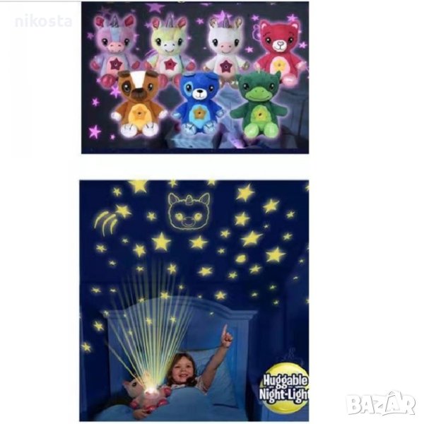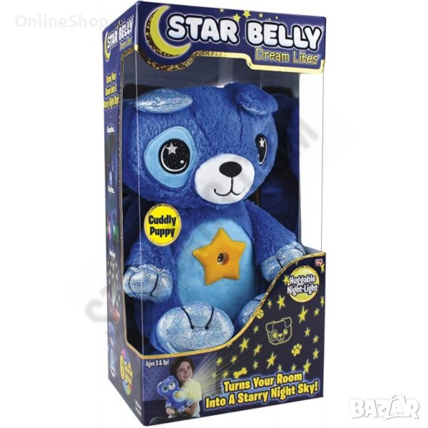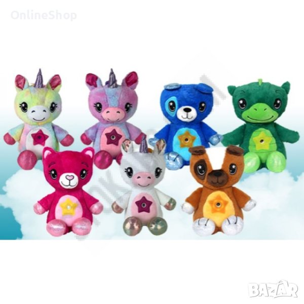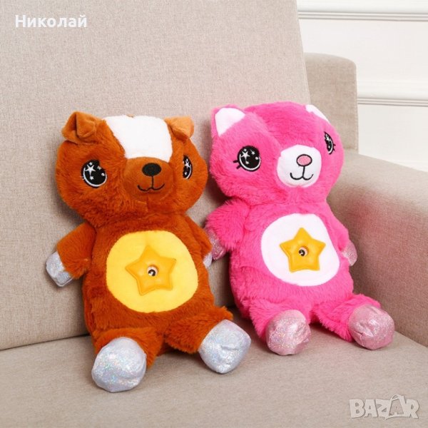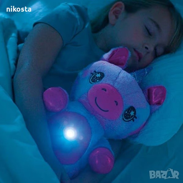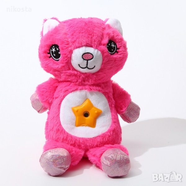 Описание: Много малки деца не обичат тъмното, така че заспиването може да бъде по-трудно. Изненадайте детето си с тази светеща, плюшена играчка и направете заспиването лесно и забавно. След натискане на копчето, на коремчето се включва проекторът, който магически осветява тавана. Бавно движещите се звезди могат да светят в различни цветове, а след 20 минути угасват сами. Изработена от безвреден материал, което я прави напълно безопасна за употреба от най-малките, тъй като не съдържа малки и лесни за поглъщане частици. Меката светлина, приятната на допир материя и приспивните мелодии ще успокоят вашето дете и заспиването ще е лесно и вълшебно! Играчката работи с 3бр. батерии "ААА".(не са включени в комплекта)
