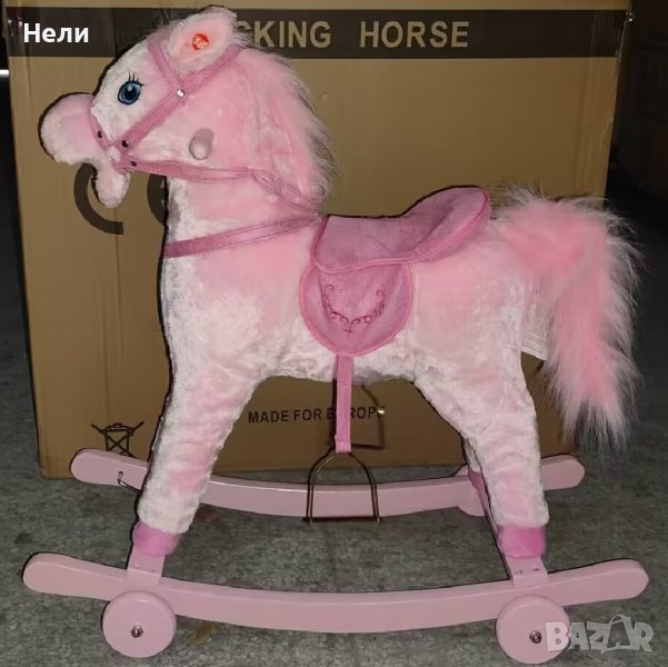 Детско конче люлка с колелца.За употреба от деца на възраст над 24 месеца. Максимална товаропоносимост 50 кг.Музикални функции на играчката - звук, който наподобява цвилене на кон. Работи с 3 броя батерии AA 1.5 V.Играчката може да се ползва само от едно дете, за да се избегнат