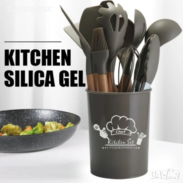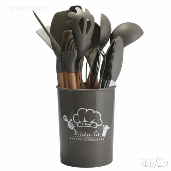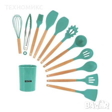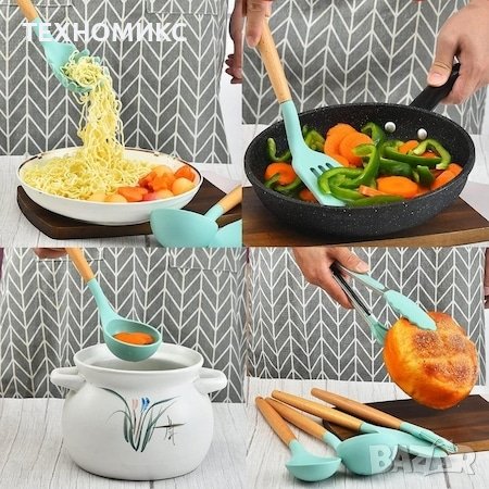 НЕЖНИ И ПРАКТИЧНИ ЦВЕТОВЕ. Материал: силикон с дървени дръжки. Този комплект представлява идеалния спътник за вашата кухня, като комбинира стил, функционалност и издръжливост в едно. Всеки от приборите е създаден с внимание към детайлите и изработен от висококачествен силикон, който е безопасен за хранене, лесен за почистване и не надрасква вашите тигани и тенджери. Дървените дръжки придават на всеки инструмент топлина и естетика, правейки ги подходящи както за професионални готвачи, така и за любители на кулинарното изкуство.