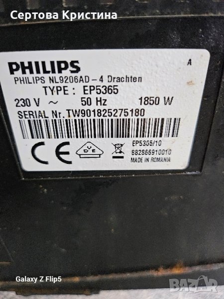 🔊‼ПРОДАВА СЕ‼🔊📌КАФЕАВТОМАТ PHILIPS EP5365 🤎☕👌🏻 ✅Пет напитки ✅Вградена кана за мляко✅Неръждаема стомана ✅AquaClean📌Използвана с нормални следи от употреба!👌🏻📌Внос🇩🇪✅Капацитет на съда за зърна: 250 г ✅Капацитет на съда за отпадъци: 15 чаши✅Обемен воден резервоар: 1,8 л ✅Дължина на кабела: 1,0 м✅Макс. височина на чашата: 150 мм ✅Капацитет на каната за мляко: 0,5 л✅Налягане на помпата: 15 бара ✅Захранване: 1850 W✅Напрежение: 230 V ✅Честота: 50 Hz✅Настройки на силата на аромата: 5 ✅Настройки на мелачката: 5✅Настройки за температурата: 3 ✅Опция за мляно кафе✅Автоматично изплакване и направлявано декалциране.✅Бързо почистване на каната за мляко! ✅Размери на продукта (ШxДxВ): 221 x 340 x 430 мм✅Тегло на изделието: 7,2 кг​Видео изпращам на лично при интерес! 💢💢💢ЦЕНА:350💢💢💢📌За гр.София и област София може и лично предаване🤝🏻 📳 0️⃣8️⃣8️⃣8️⃣2️⃣9️⃣7️⃣4️⃣3️⃣6️⃣📳