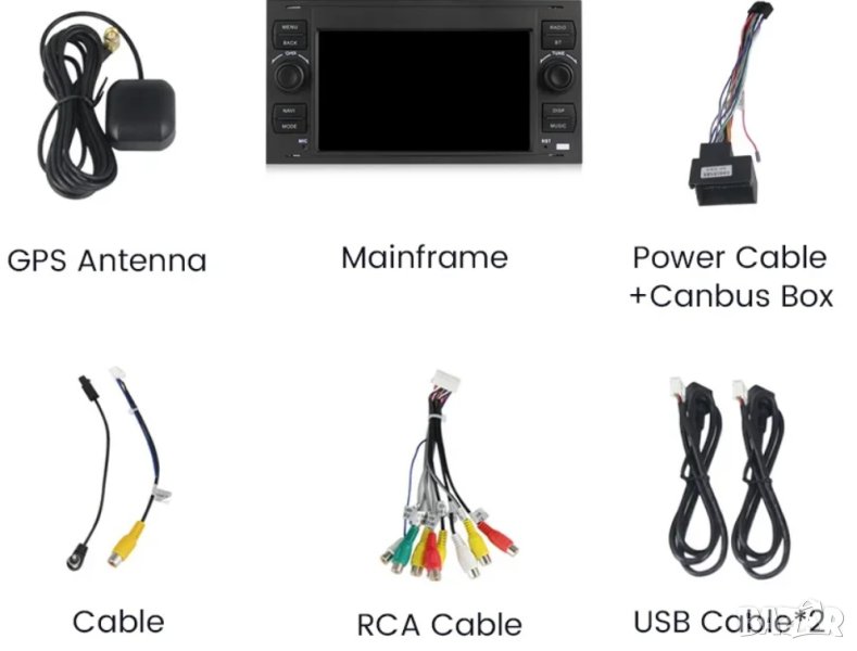 Пълен комплект с цялата рамка, преходни кабели и букси, декодери, предназначени и съвместими за монтиране на конкретния модел автомобил.
