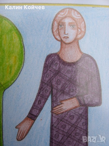 Рисувана е с цветни моливи върху бяла хартия.