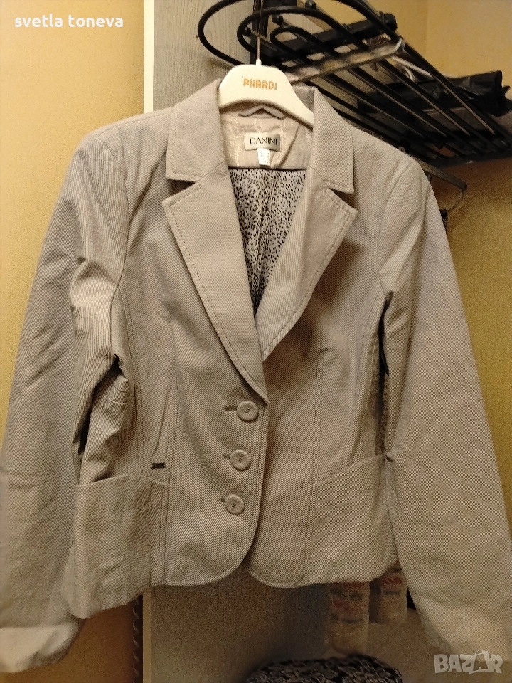 Сиво елегантно сако Danini.BG 48.Размери:рамо 36см,ръкав-36см,гр. об.-102см,дължина-56см.Материя:61%памук,39%полиамид;хастар-85,%памук+13,%полиестер+2,%еластан