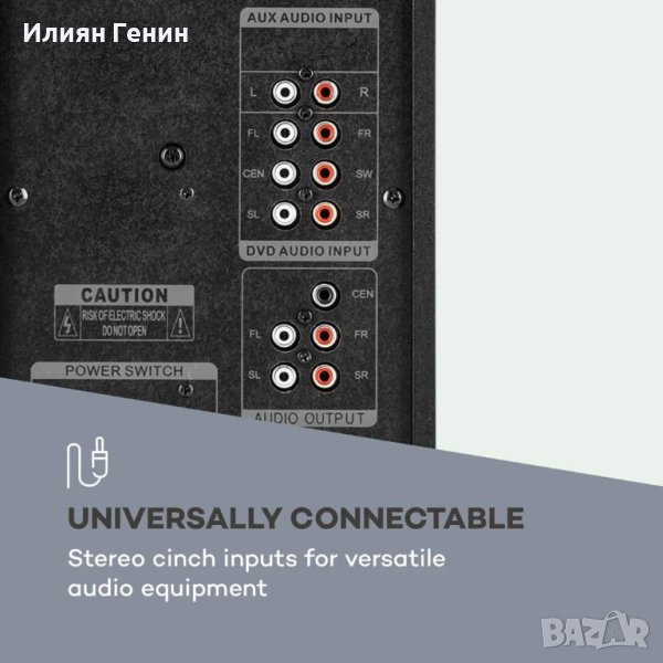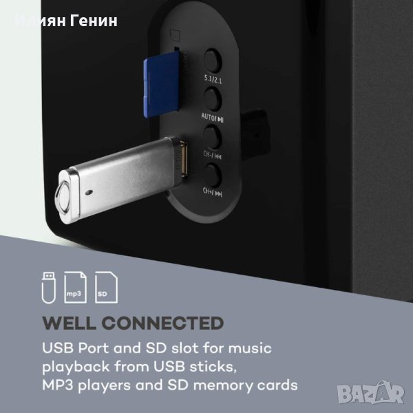 Връзки: 1 x USB порт, 1 x SD слот за карта памет, 1 x комплект 5.1 RCA вход, 1 x комплект RCA жакове за тонколона