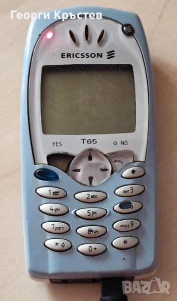 Ericsson T65 - телефона не включва, на зарядно диода свети, но нищо повече, може и от батерията да е, но приемаме, че е за части, добър външен вид, но един бутон го няма, без зарядно.