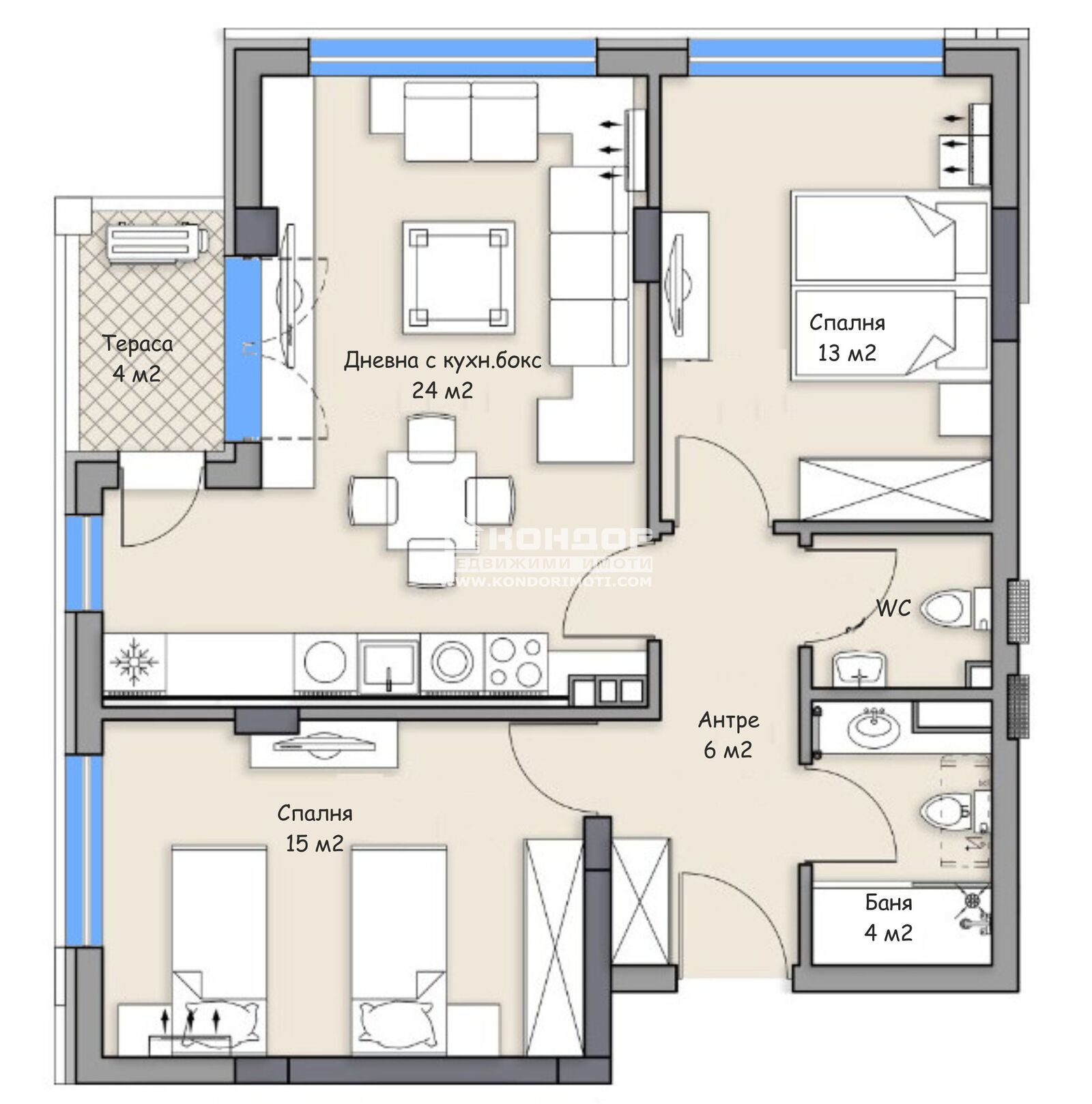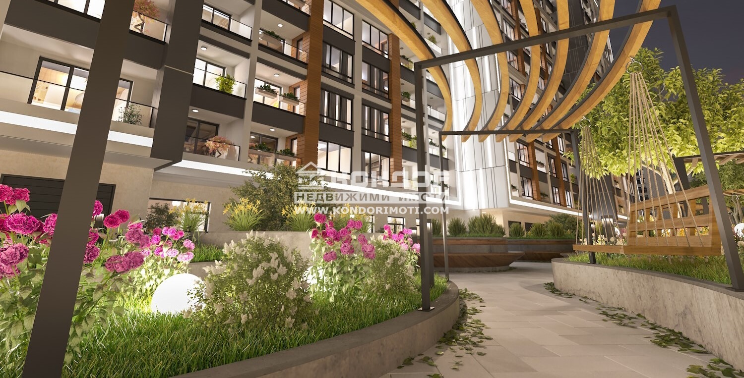 Оферта 63327: Новоизградена модерна сграда със стилен дизайн, която съчетава удобството на градската среда и спокойствието на тихата локация. В близост са големи хипермаркети, аптеки, детски градини и училища. Апартаментите са с изключително добро разпределение. Предлагаме ви, тристаен апартамент, състои се от широко входно антре с място за гардероб, светла ъглова дневна 24кв.м. с кухненска част и трапезария, две самостоятелни спални: голяма родителска спалня 15кв.м. и детска 13кв.м., баня с тоалетна, втора тоалетна и една тераса. За удобството на всеки живущ са осигурени достатъчен брой гаражи и паркоместа. Изпълнението на сградата е с висококачествени материали и съвременни технологии по европейски стандарт, петкамерна PVC дограма, блиндирани входни врати, електрическа асансьорна уредба, топло и хидро изолация - 10см. Луксозни общи части с гранитни плочи. Жилищата ще са завършени до степен шпакловка и замазка, монтирани ключове и контакти както и с положени настилки по терасите от гранитогрес. Разсрочено плащане в рамките на строителството и съдействие при банково кредитиране. Предлагат се индивидуални и гъвкави схеми на плащане. Проектът е изпълнен от реномиран строител.