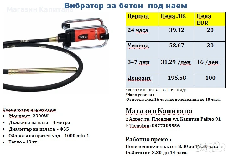 Вибратор за бетон под наем с дължина на жилото 4 метра и вибрираща глава ф35. Иглен вибратор за бетон под наем се използва когато е необходимо да се изкарат въздушните кухини получаващи се при изливането на бетон, като по този начин се осигурява плътност и максимална якост на бетоновите конструкции. С диаметър на вибриращата глава от 35 мм., този вибратор за бетон под наем е идеалното решение за вибриране на бетон от колони, земетръсни шайби и други гъсто армирани конструкции. Електрическите вибратори за бетон под наем, са едни от най-често използваните машини под наем в строителството.