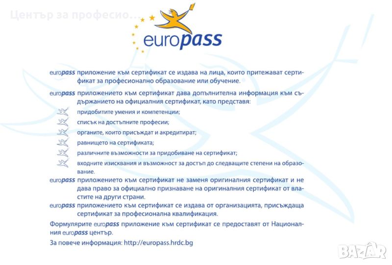- безплатен EUROPASS на български и чужд език по избор - европейски паспорт, който позволява практикуването на придобитата квалификация. В него се посочват длъжностите, които курсиста може да заема и дават предимство при кандидатстване за работа.