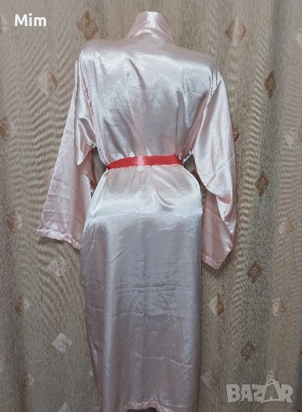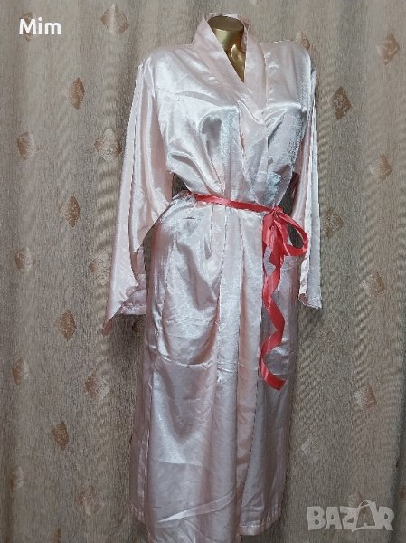 Светло розов сатенен плътен халат с дълъг ръкав с премятане .По етикет е S ,но според мен е за по голям размер давам размера в см. рамена 47 см едностранно, подгръдна 62 см едностранно надолу се спуска свободно, дължина 120 см,дължина на ръкавите 57 см .странично с два вътрешни джобове ,завързва се със сатенена лента Няма забележки.