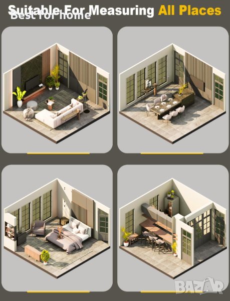 РАЗНООБРАЗНА ФУНКЦИОНАЛНОСТ Този далекомер може да изпълнява различни функции, включително измерване на площ, разстояние, дължина, обем, непрекъснато измерване и теорема на Питагор/събиране и изваждане. Това го прави ценен инструмент за различни приложения.