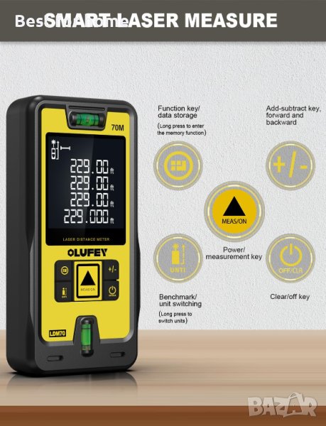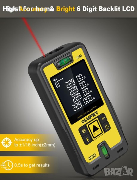 ВИСОКОТОЧНО ИЗМЕРВАНЕ Лазерният далекомер Olufey може да измерва разстояния до 70 метра с точност от само ±2 mm. Може да превключва между мерните единици ft/m/in, което го прави идеален за измервания с висока точност.