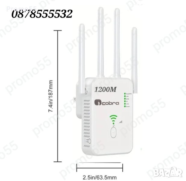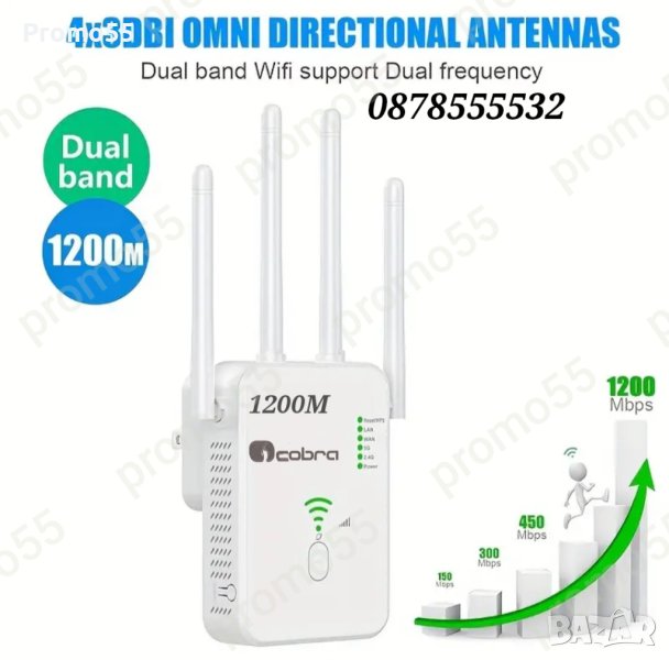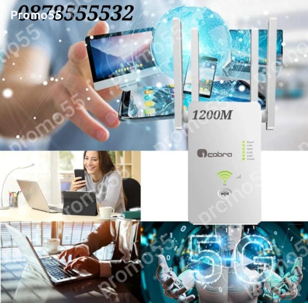 Универсален WiFi усилвател, репитер с двойна честота 2.4G и 5G и изключително мощни 4 антени. Усилвателят на WiFi сигнала е проектиран да работи едновременно като разширител, рутер и AP. Подходящ е предимно за домове, офиси или складове, където имате нужда от силен сигнал и трябва да имате свързани няколко уреда, като смарт телевизор, приемник, компютър, мобилни телефони и др.