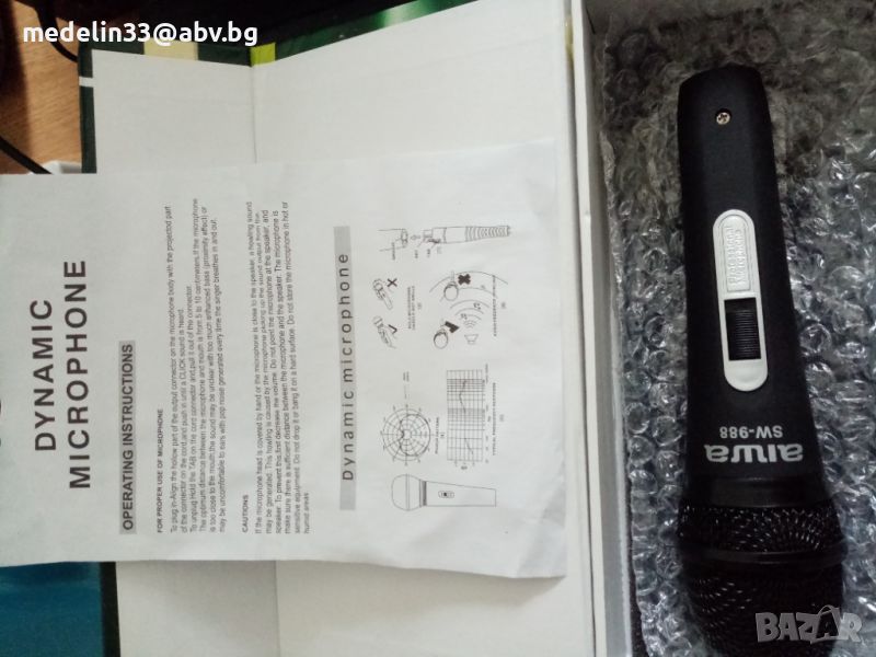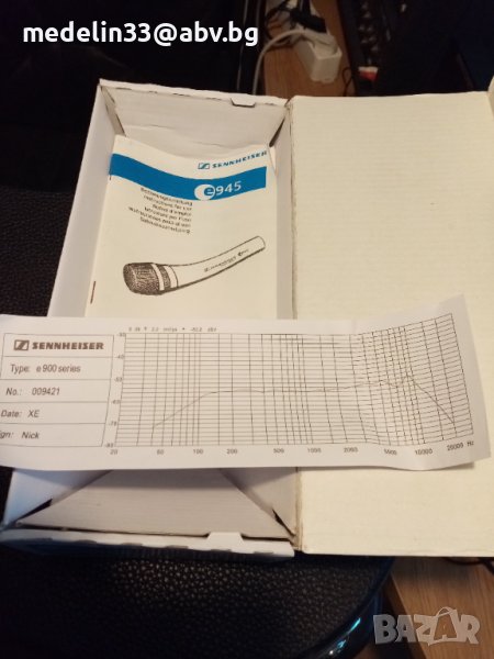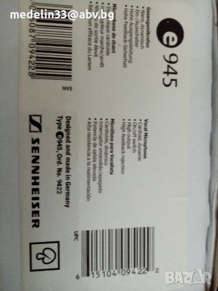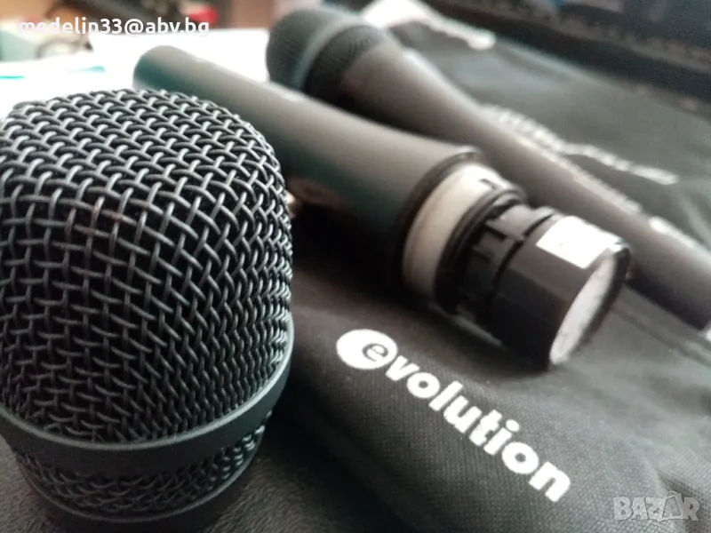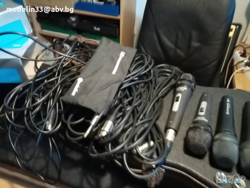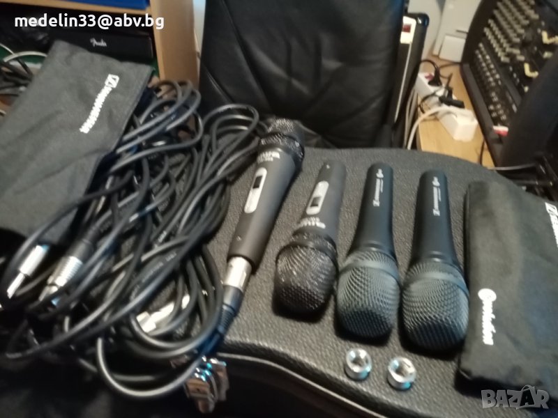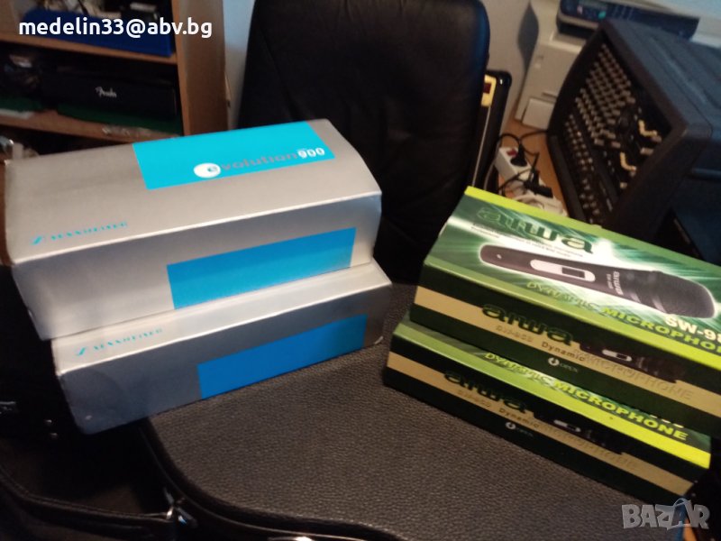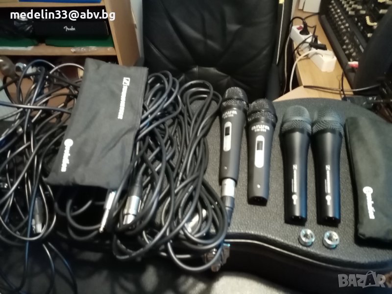 Както виждате на снимките микрофоните са нови с кабели по 6 м, с жак в края. Много качественни немски, динамични само са изпробвани, вървят с кабелите и кутиите. Цената на тези Sennhizer E945 в Muziker в момента на промоция са 200 лв за брой. Цените са Sennheizer Evolution 945- 60 euro за 1 брой, ако се вземат двата броя за по 50 euro, общо 100 euro., AIWA SW-988 - 25 euro за 1 бройКабелите са по 10 euro за брой за Sennheizer и по 7 euro за брой за Aiwa.Sennheizer нямат прекъсвач за изключвсне от микрофона, а AIWA имат. И двата модела са динамични и могат да вършат добра работа за тази добра цена. Ако се вземат наведнъж от един купувач всичко микрофони и кабели са 200 euro общо.Имам също и 3 броя нови стойки чупещи за микрофони с накрайници за по 20 euro за брой.Ако се купят микрофони, кабели и стойки от един купувач всичко е за 250 euro. При интерес от някой за стойките мога да направя снимки и да ви изпратя.