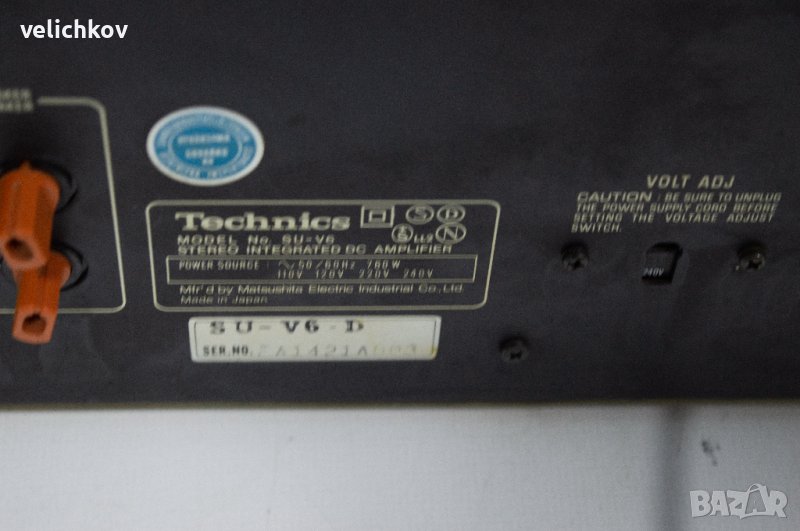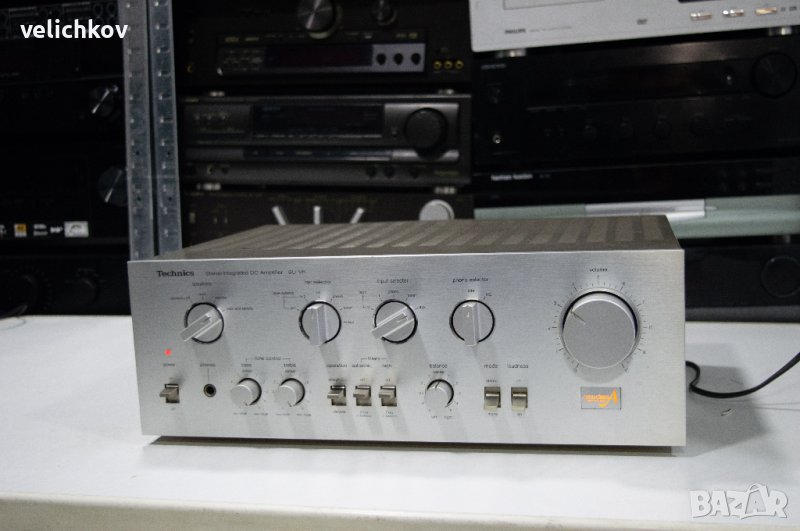 Висок клас транзисторен стерео усилвател Technics model SU-V6. С много добър външен вид . Качествена и солидна изработка с маркови елементи, крайните транзистори са Toshiba и са разположени върху два независими охлаждащи радиатора, захранващия трансформатор е 760w. Мощността му при съпротивление 4ohm е 2x100w, а при съпротивление 8ohm e 2x70w. Произведен е в Япония. Качествен и мощен звук!!!