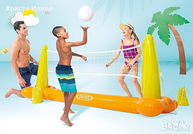 Комплект за воден волейбол Intex включва всичко необходимо за игра на волейбол в басейна. Мрежата е закачена на надуваема основа и греди, и стои в изправено положение във водата. Пренасянето и е лесно и безпроблемнно. Към комплекта е включена и топка за плажен волейбол, подходяща за игра както от големи така и за по-малките.