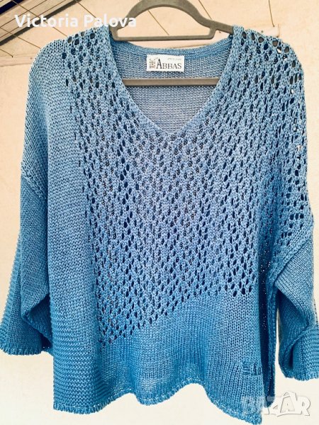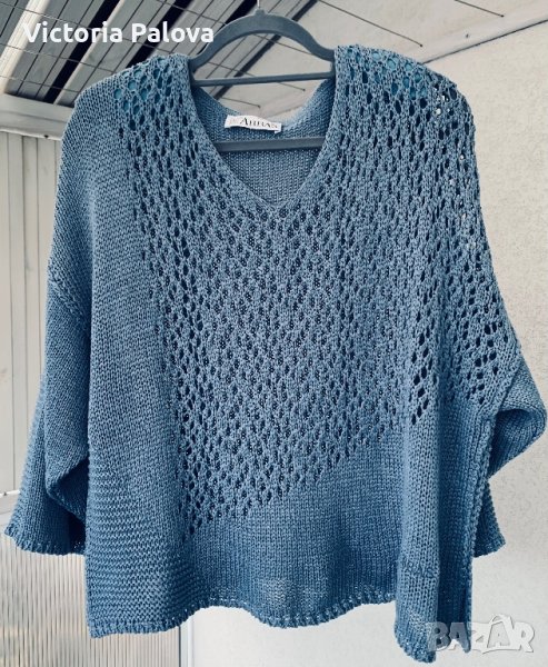 Модерна свободна блуза кроп, много красива и интересна, със сваляеми подплънки, супер цвят, широка, с цепки отстрани, паднало рамо. Шев от рамо до рамо -70см, ГО - 70см, дължина - 62см, рамо - 36см.