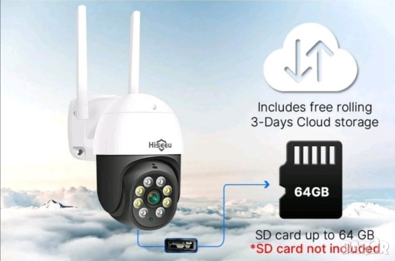 – Два метода за съхранение: Камерата за сигурност може да съхранява снимки и видеоклипове чрез SD карта (по избор, не е включена в комплекта) или съхранение в облак (изисква се абонамент), можете да преглеждате запазените моменти по всяко време чрез приложението ICsee или карта с памет.