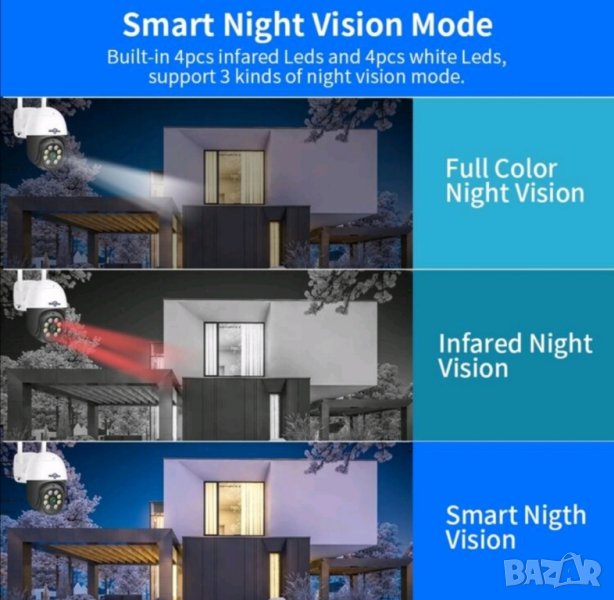 – Детектор за движение: Когато камерата засече човешко движение през нощта, тя ще светне и ще изпрати известие към вашия мобилен телефон.(по ваше желание, настройва се от приложението).