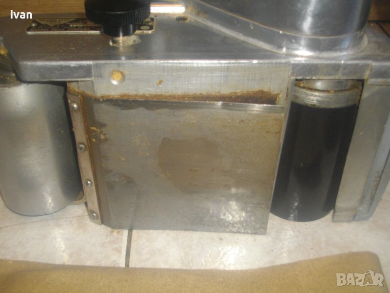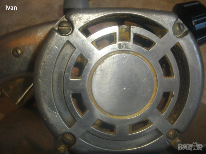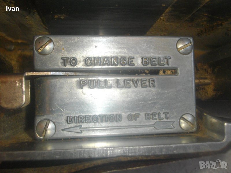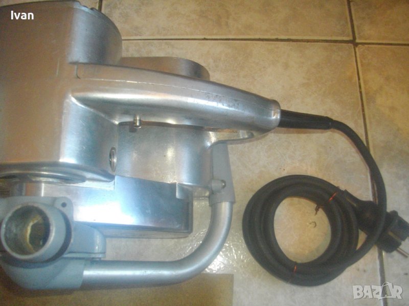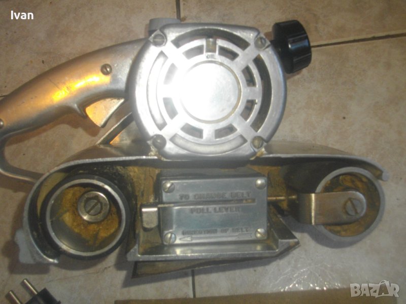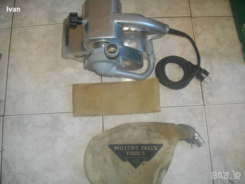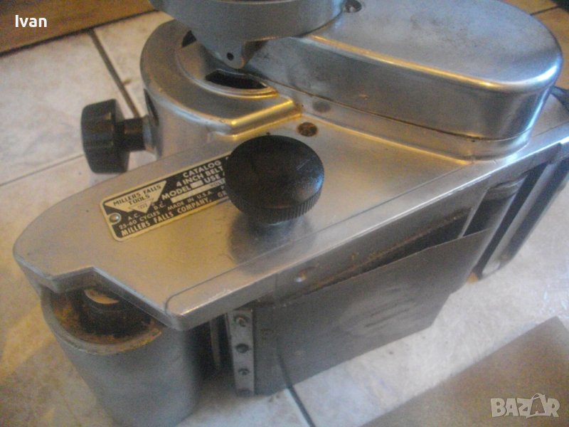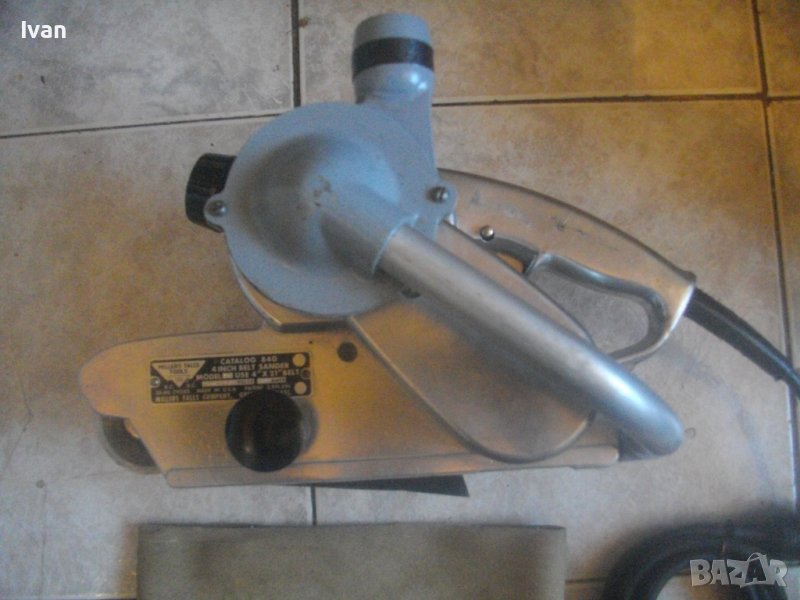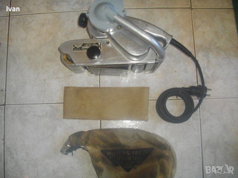 ОПИСАНИЕ на голям лентов шлайф - цена 399 лв. Оригинален САЩ марка и оригинално САЩ производство. Професионален. Помти нов, в отлично техническо/работно състояние. Без забележки. Марка, модеел, маркировки, производство, производител - MILLER FALLS Since 1868. Miller Falls Tools Cince 1868 Catalog 840 - 4 inch, To Chance Belt Pull Lever Direction Of Belt Sander. Model C use 4" х 21" Belt - Made in USA - Patent 2.991.595 - Millers Falls Company - Greeenfield, MASS. Лентовия шлайф е изцяло алумин и стомана с неръждавейка инокс покритие. Голям, масивен. Захранване - 220-250 волта, защита 3,7 ампера, 25-60 Cycles. Налична оригиналната березентова торба за прах, с лого на марката и голям цип за изпразване на дървесния отпадъчен талаш. Размери на торбата - 300 х 200 мм. Оригинален захранващ гумиран многожилен кабел, оригинален гумиран щепсел. Поставена оригинална универсална шкурка - шлифовъчна лента/пояс - ползвана, мека зърненост, с ширина 100 мм. Гумиран заден амортисьор на машината, бакелитова предна дръжка, алуминиев голям преден ролков водач на лентата. Старнична стоманена врътка за отваряне и поставяне на шкурката. Тегло на машината - 7,0 кг.