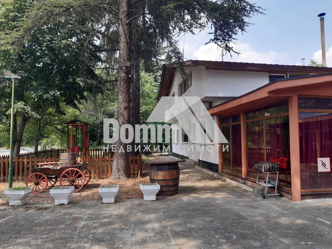 Имотът е с РЗП 880 кв.м., на 2 етажа, 11 паркоместа, външен бар с барбекю, детска площадка, лице на главен път, ток, вода от собствен водоизточник.