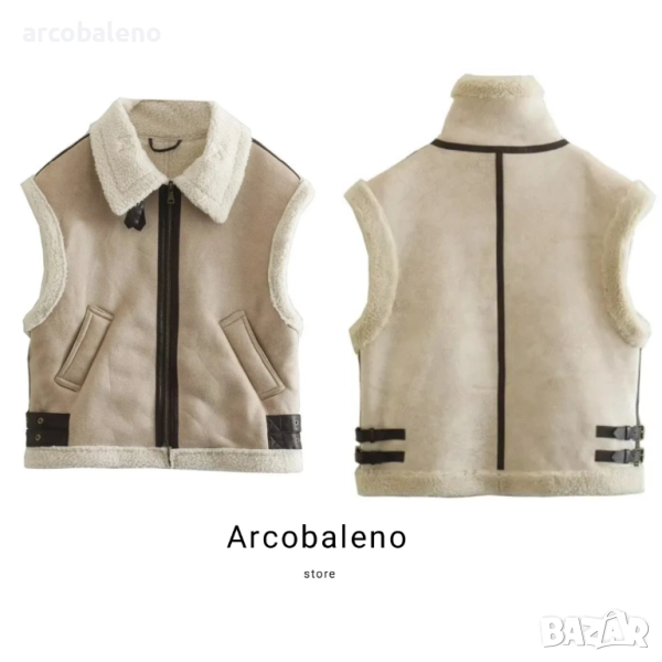 Дамско топло широко кожено яке без ръкави с шевове от полар, 2цвята