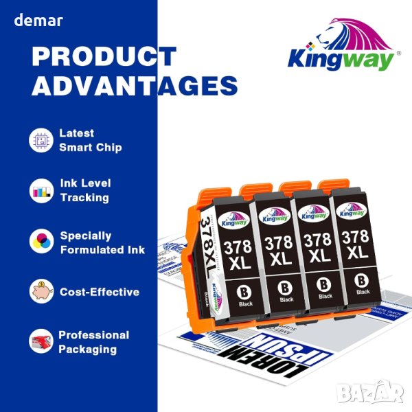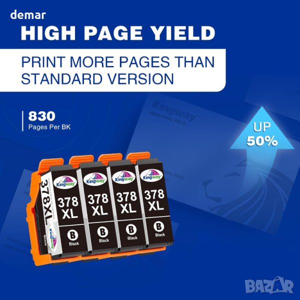 Пакетът Kingway 378 XL Ink Cartridges включва 4 черни касети и 1 ръководство за потребителя. Тези касети са съвместими с принтери Epson Expression Photo XP-8000, XP-8005, XP-8500, XP-8505, XP-8600, XP-8605 и XP-8700. Те предлагат висок капацитет на страници от приблизително 500 страници на черна касета 378XL при 5% покритие на хартия A4. Всяка касета съдържа 13,5 мл мастило. Касетите се доставят с най-новите актуализирани чипове за висока съвместимост и са проектирани да доставят живи цветове, удебелен и остър текст и ясни и чисти документи, които издържат десетилетия. С висок капацитет на страници те са рентабилни за ежедневна употреба, осигурявайки отлично качество на малка част от първоначалните цени. Освен това всяка касета е вакуумно запечатана, напълно тествана и има срок на годност от 24 месеца, което гарантира надеждност и гарантиране на качеството.