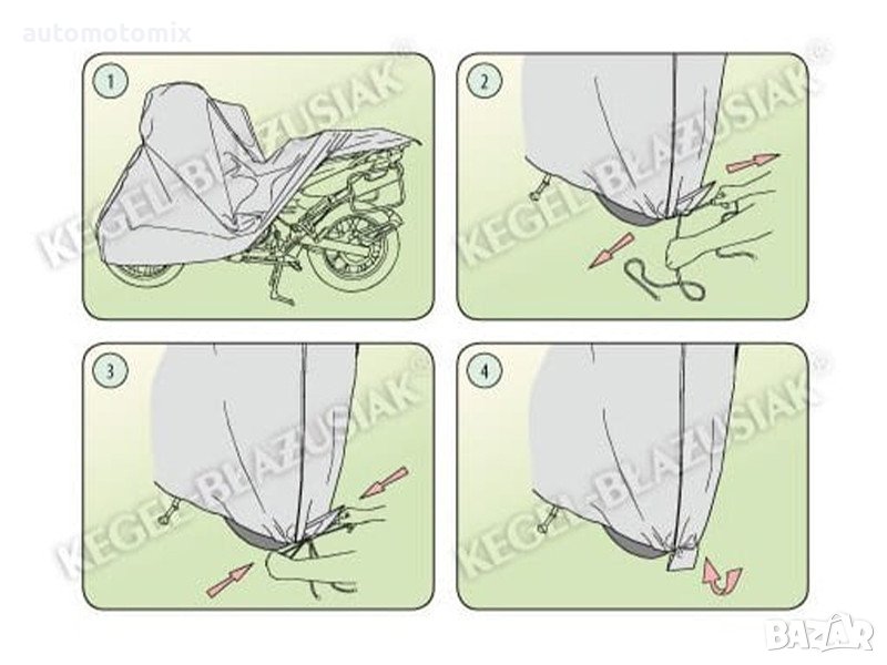Покритието е сиво, което е изключително практично и в същото време изглежда страхотно. В средата има надпис, показващ името на производителя и фирменото лого, както и името на материала, от който е изработен - това ще гарантира оригиналността и високото качество на продукта. Разнообразието от форми и размери означава, че можете да изберете покривало, което ще пасне добре на вашия мотоциклет.