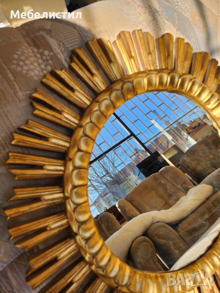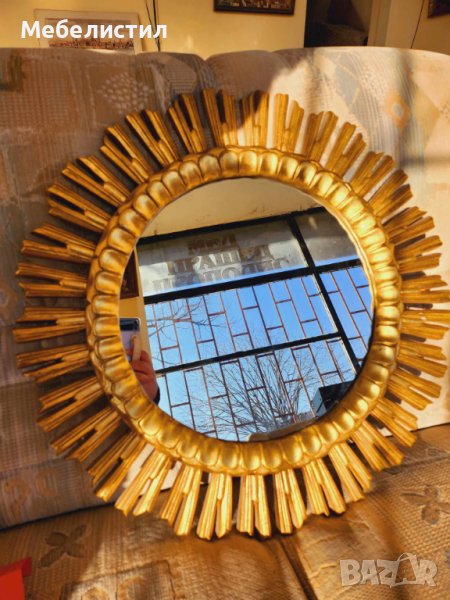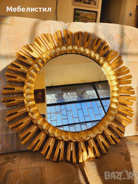 Огледало с разкошна рамка със позлата. Лека забележка в рамката, съобразно с цената. Размери на огледалото 35см. Размери с рамката 60 см.