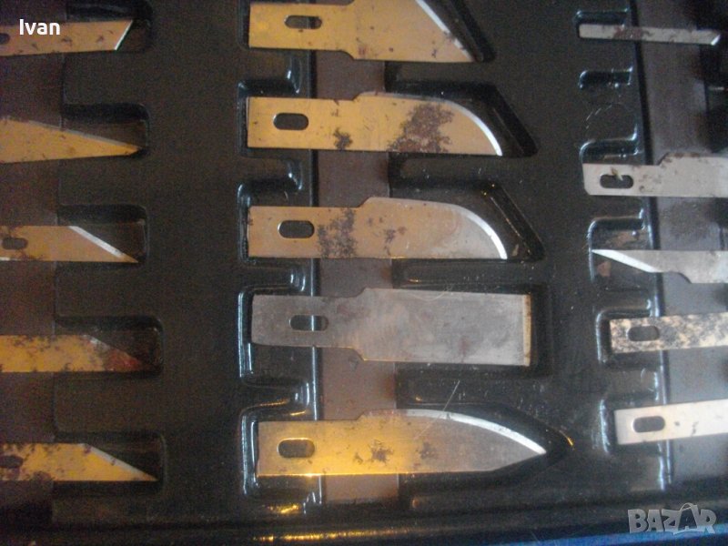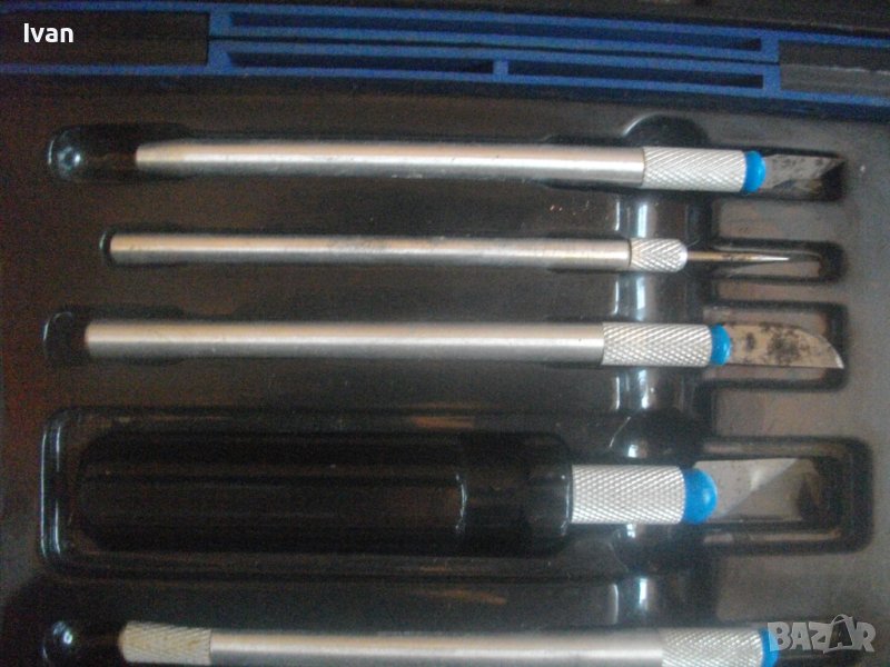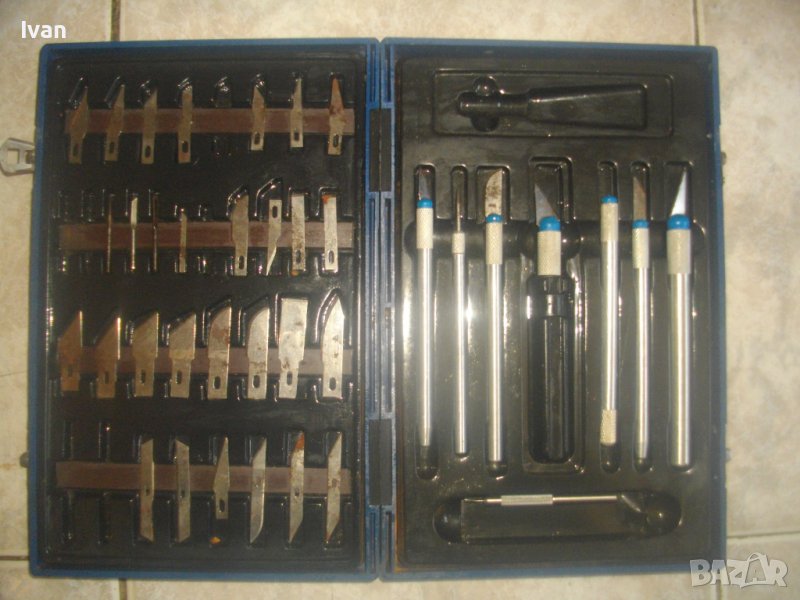 ОПИСАНИЕ на комплект фини резци за дърво в синя кутия. Цена 79 лв. Старо качество комплект непълен с с фини резци и държачи различни за оббработка на дърво и дърворезба. Общо налични части в комплекта 44 бр. /36 бр. различни резци и 8 различни държача алуминиеви и бакелит дръжки за резците/. Оригинална кутия с оригинална вложка за местата на различните компоненти. Липсват няколко резци и камъка брус за заточване на остриетата. Повеето остриета са съвсем нови, неизползвани, изключително остри. Размери на кутията - 255 х 165 х 35 мм, с метални копчалки в пълна изправност. Марка на комплекта - HBM. Държачите за остриетата са различни - големи, малки, средни - с възможност а захват на острие вертикално и хоризонтално. Резците са с различна форма и различно приложение. Част от тях са накрайници тип игли. Тегло на комплекта с кутията - 1,0 кг. Цената е твърда и без коментар - 79 лв.