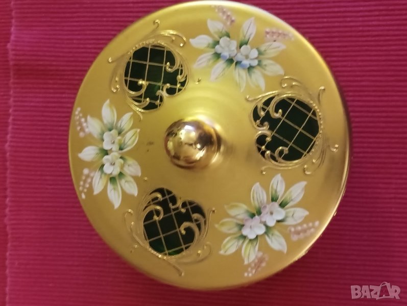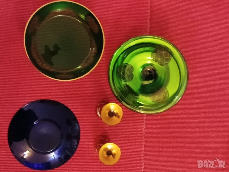 Стар сервиз от цветно стъкло, 6 части, инкрустиран със злато, релефни апликации. Бонбониерата е в зилено, чинийката в синьо, чашите в червено. Сервиза е много красив, няма забележки.