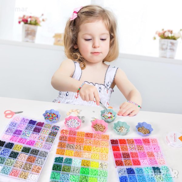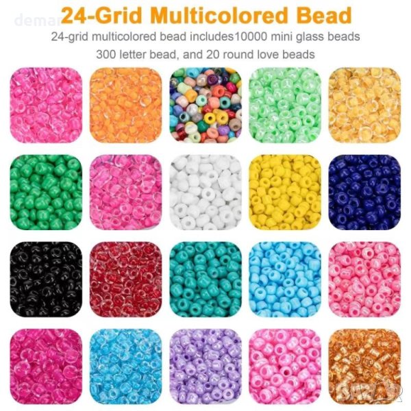комплект мъниста е изработен от висококачествен, издръжлив материал, гарантиращ безопасност и екологичност. Мини стъклените перли имат гладка повърхност, което ги прави многократно използвани и идеални за изработка на различни бижута. Комплектът включва 10 320 мъниста с размер 3 мм и се предлага в 20 различни цвята. Също така съдържа 300 мъниста с букви, 20 мъниста във формата на сърце и основни аксесоари. Тези мини мъниста се използват широко за изработка на бижута като гривни, обеци, пръстени и колиета, както и модни аксесоари „Направи си сам“. Те могат да укрепят отношенията родител-дете и да подобрят креативността на децата. Идеален подарък за рожден ден, Коледа и други поводи, удобно прибран в пластмасова кутия с 24 отделения. Забележка: За деца под 5 години се препоръчва наблюдение от възрастен поради малки мъниста и аксесоари.